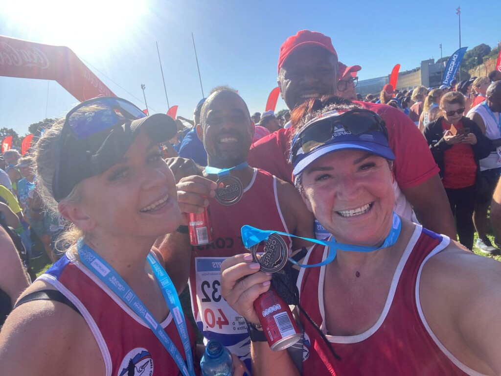 From Nelia Henry:  What a day! I’ve been keeping a cold at bay the whole week, but woke up this morning feeling good. Don (always my hero) spotted me along the way so many times and lifted my spirits! Needed the loo early on (despite going before I started), wasted time at 12km waiting for a loo then continued, feeling strong…..but from about 25ish km (I think) my tummy started burbling…..it was NOT happy. The 6:45 bus caught up with me on Chappies……I tried keeping up with their walk run but I was tired! Started cramping from about 32km When I got into Hout Bay I couldn’t anymore and thankfully spotted loos….SJOE! Welcome relief! Thinking it was all done….I set off again, saw my uncle, Mervyn Lee just at the bottom of Constantia Nek, he rubbed my legs down which helped for a km or 2! I was very teary seeing him, knowing I was way behind on my time already. Walked most of the Nek. Don was at the top…no time to stop….I barely made it to the loo!! My stomach had been cramping REALLY badly at this point – to the point where I was doubled up and couldn’t move! Off again…..10km to go….1hr10min left….Another loo stop At 50.5km I spotted the Westie girls and we did a little out and back to make distance. Cindy Calitz ran with me a little way urging me on. By this time I was very scared I wouldn’t make it. Wanting to walk…then telling myself I HAVE to run (shuffle) I crossed the line at 7:00:23. They gave me a medal. There were MANY tears! There was some confusion as to whether each batch would be timed individually or if the cut off was 7hrs after the last batch (which is what they did the count down for at the end). Checking the Two Oceans site, my profile shows “Did Not Finish” so I’ll do it again next year for my first time! End of the day I ran for 56km….not many can say that! I know that I CAN do it in under 7hrs…today my body just wasn’t well enough – 4 loo stops wasted so much time, not to mention the time doubled up or the fact that I literally and physically had nothing left in my tank – I stopped taking in nutrition after about 28km other than gels which I also stopped at about 36km It did confirm that Comrades will never be a goal for me though! As always…. Donovan Henry was amazing! I am so lucky to have him in my life! I could not have done this without his support over the last 6 months….from early morning alarms to following me over many kms with potatoes, MyO2gel and Biozest! To the MANY who sent messages, checked in with him, tracked me on the app….THANK YOU!